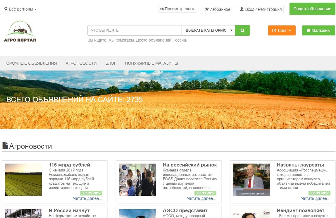 Сетевой ресурс «Агро Портал» - это новая торговая платформа, предназначенная для тех, у кого в приоритете агропромышленный бизнес. Наша аудитория постоянно растет, ведь мы создаем все условия для информационной поддержки пользователей, а также предоставляем выгодные и доступные рекламные возможности. Вы – любитель сельского хозяйства или эксперт одной из его сфер? Вы – обладатель крупного агропромышленного предприятия или только начинаете свой бизнес? Вы – обычный российский фермер? Значит, ваши объявления на нашем сайте найдут своего адресата, мы в этом уверены.